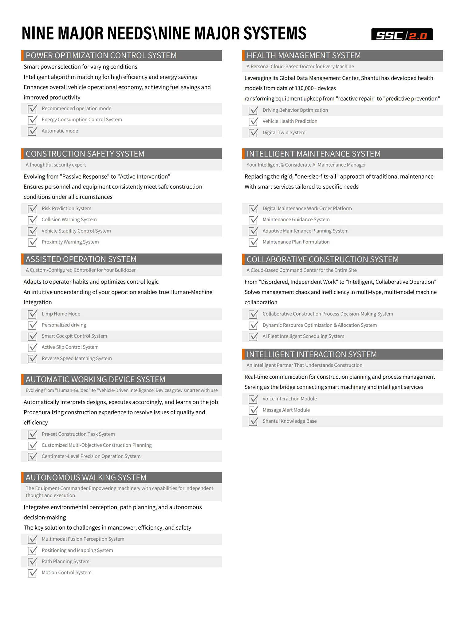 It can achieve AI upgrades based on the SSC (SHANTUI Smart Construction) technology platform, integrating AI and big data-related technologies to establish a fully intelligent closed-loop system of "perception-decision-execution." This enables working condition assessment, dynamic path optimization, and centimeter-level precision control of the blade. As a technological innovation, it leads the leap toward intelligent construction machinery, serving as a model for the industry's transition from "mechanical operation" to "intelligent decision-making.".